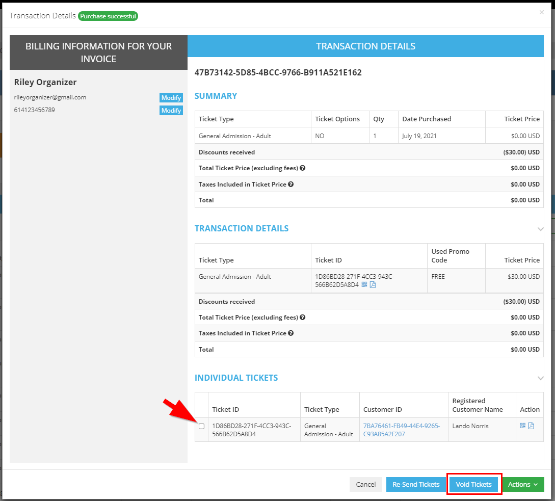 This will load the transaction details page. For this particular example (below), the ticket was free because the customer had used a promo code that discounted 100% of the ticket price.